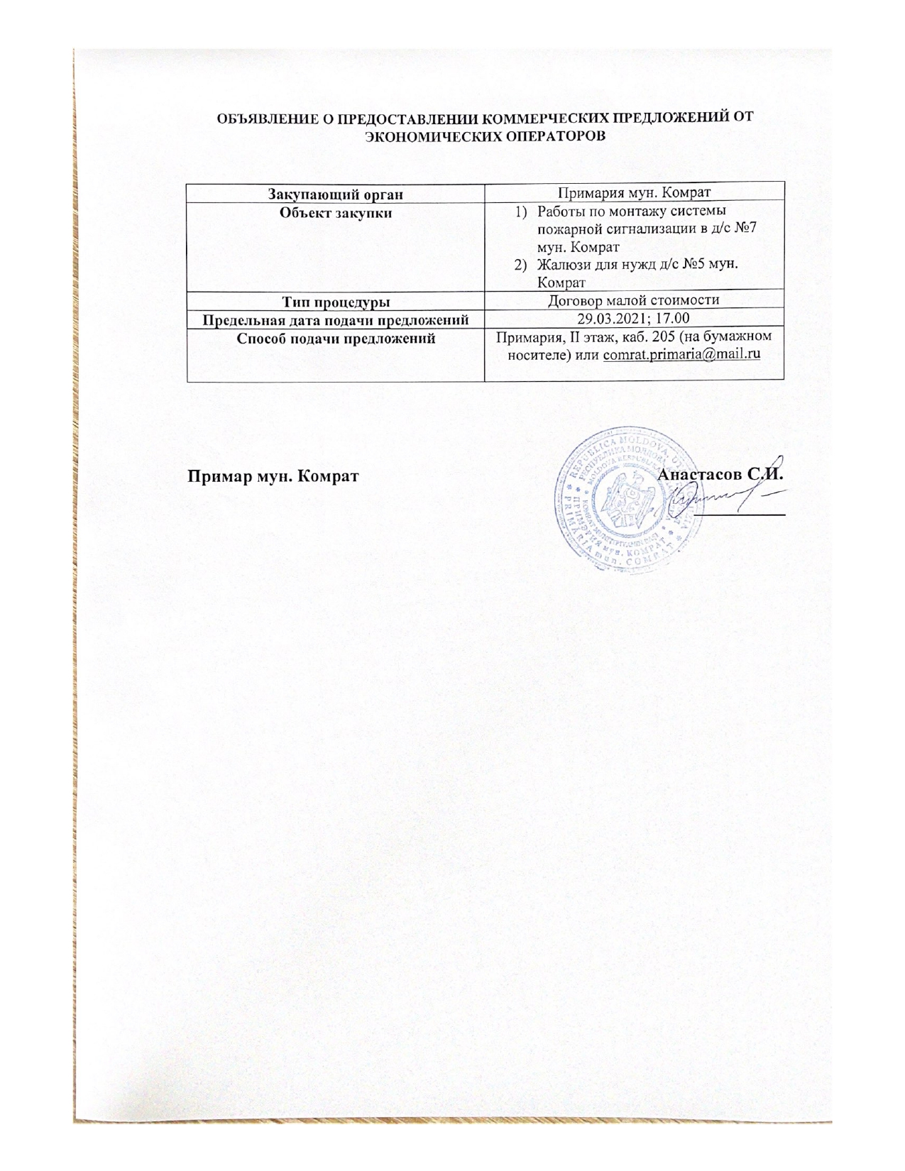 Объявление о предоставлении коммерческих предложений от экономических агентов для примэрии м.Комрат