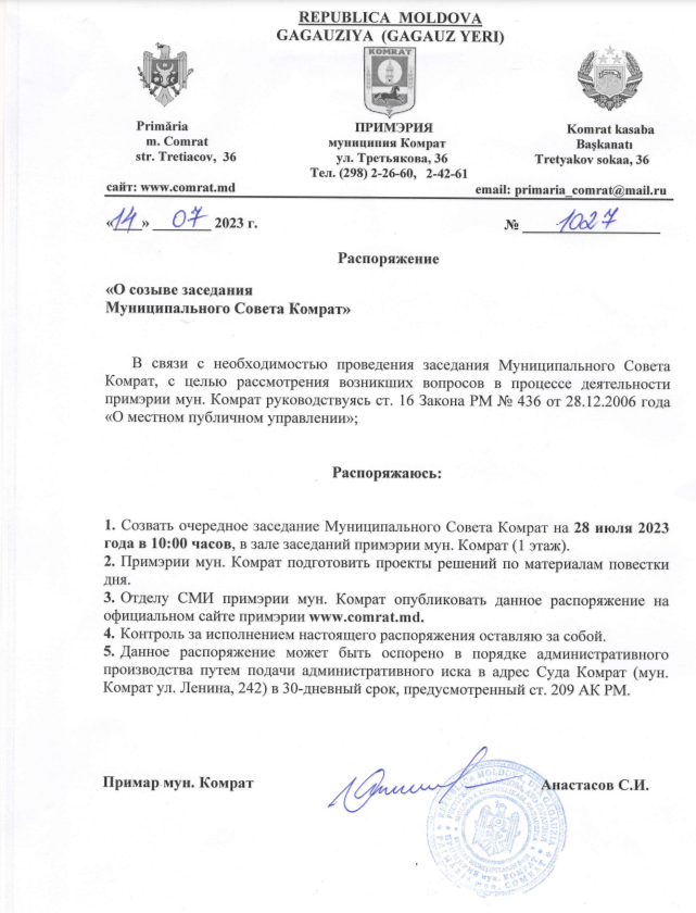 Заседание муниципального Совета Комрат состоится 28.07.2023 г. в 10:00 часов, в зале заседаний в здании примэрии мун. Комрат 1 этаж. В рамках подготовки к заседанию муниципального Совета информируем о графике работы специализированных консультативных комиссий совета:
