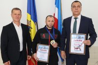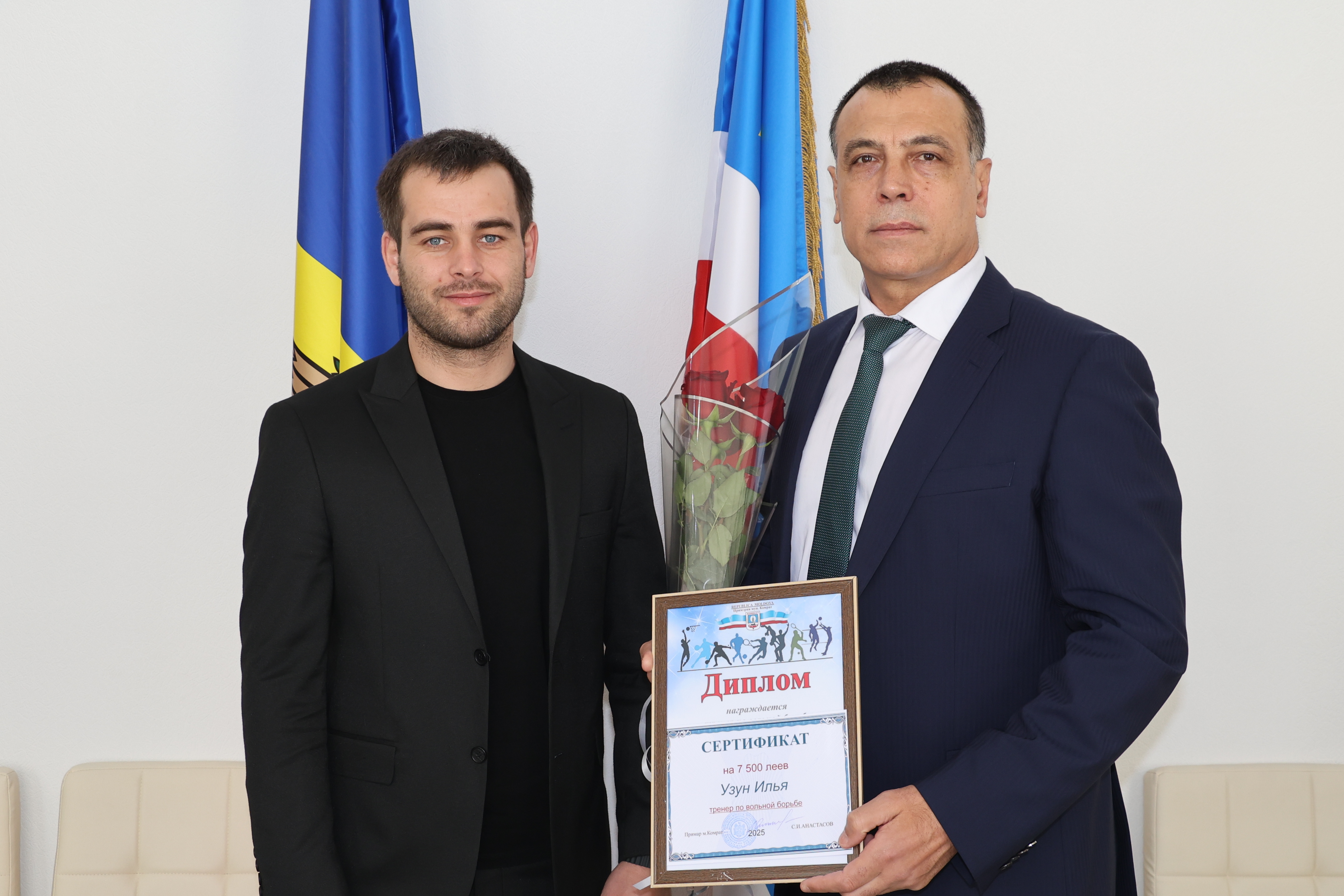 Спортсмена-вольника Дмитрия Маленкова и его тренера Илью Узуна с отличным результатом поздравили примар м.Комрат Сергей Анастасов, зам.примара Степан Кара, директор МСШ Комрат Геннадий Тулба и вручили им денежное вознаграждение.