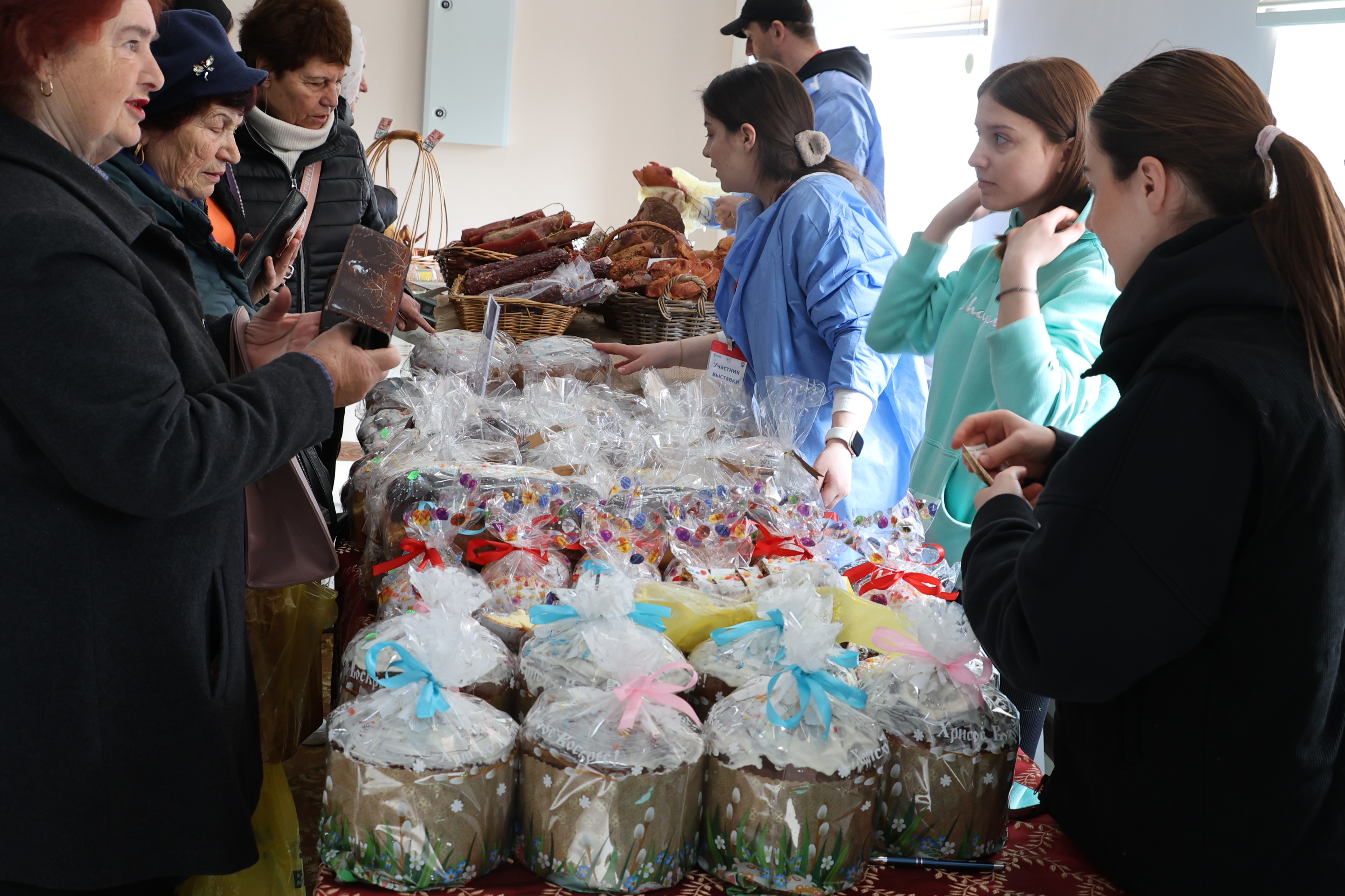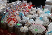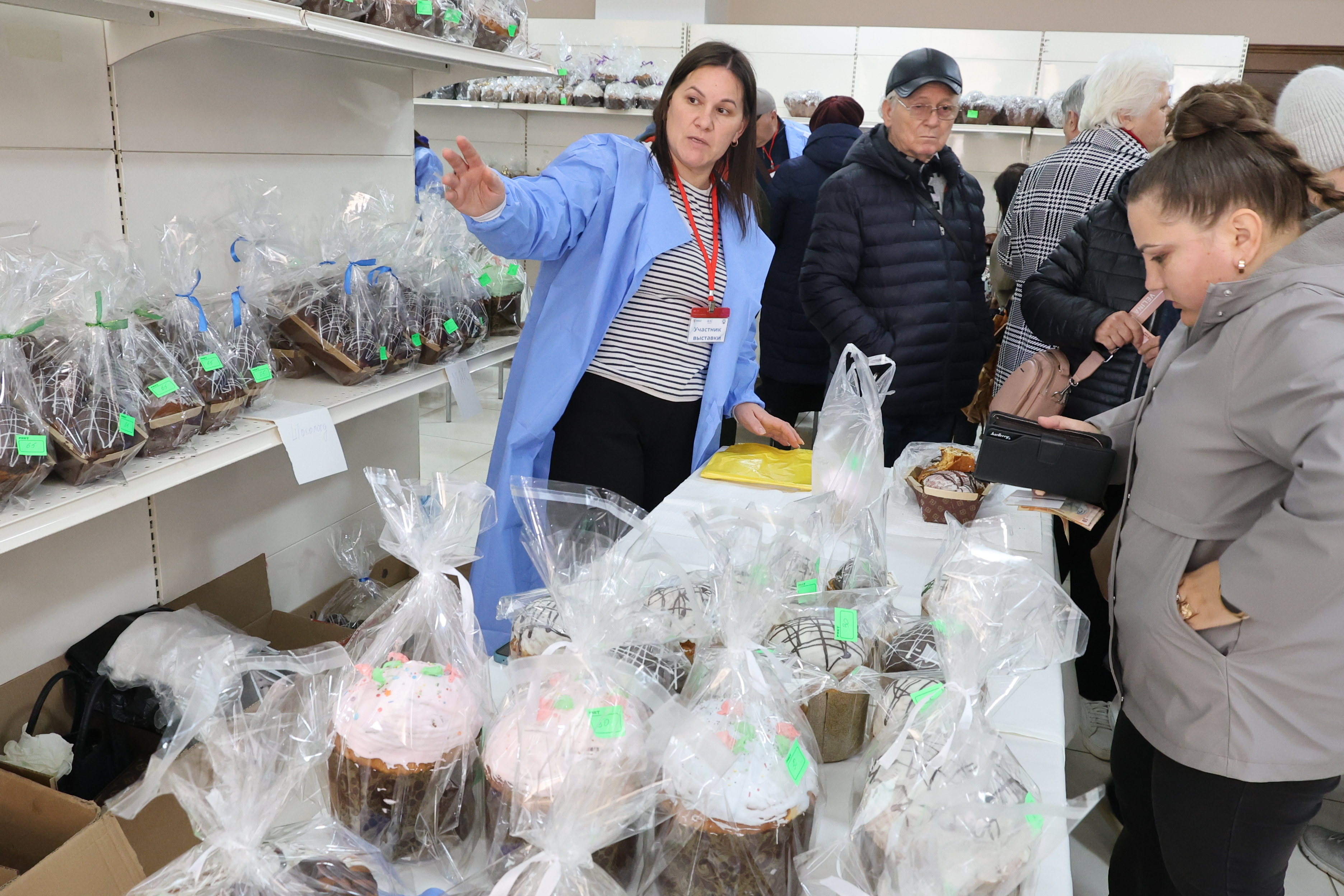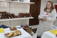 На выставке представлены товары местного производства: мясная и молочная продукция, сувениры, промышленные товары, а также пасхальная выпечка.